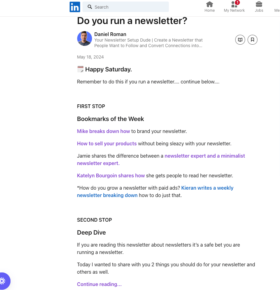 I use the LinkedIn newsletter in a fairly simple way. I share almost everything I write in my regular newsletter into my LinkedIn newsletter. The only difference is that if the reader want’s to continue reading - they need to click the link inde the LinkedIn newsletter that will take them to my newsletter to subscribe for more content. See example below.