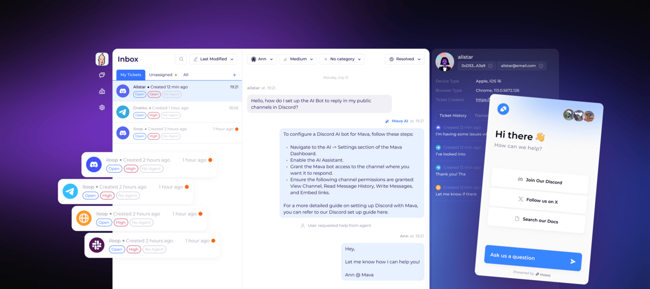 Mava is a customer support platform for community-driven companies. We connect to community channels like Discord and Telegram, as well as more traditional channels like web chat and email and enable companies to scale support across both private tickets, as well as in public conversations.