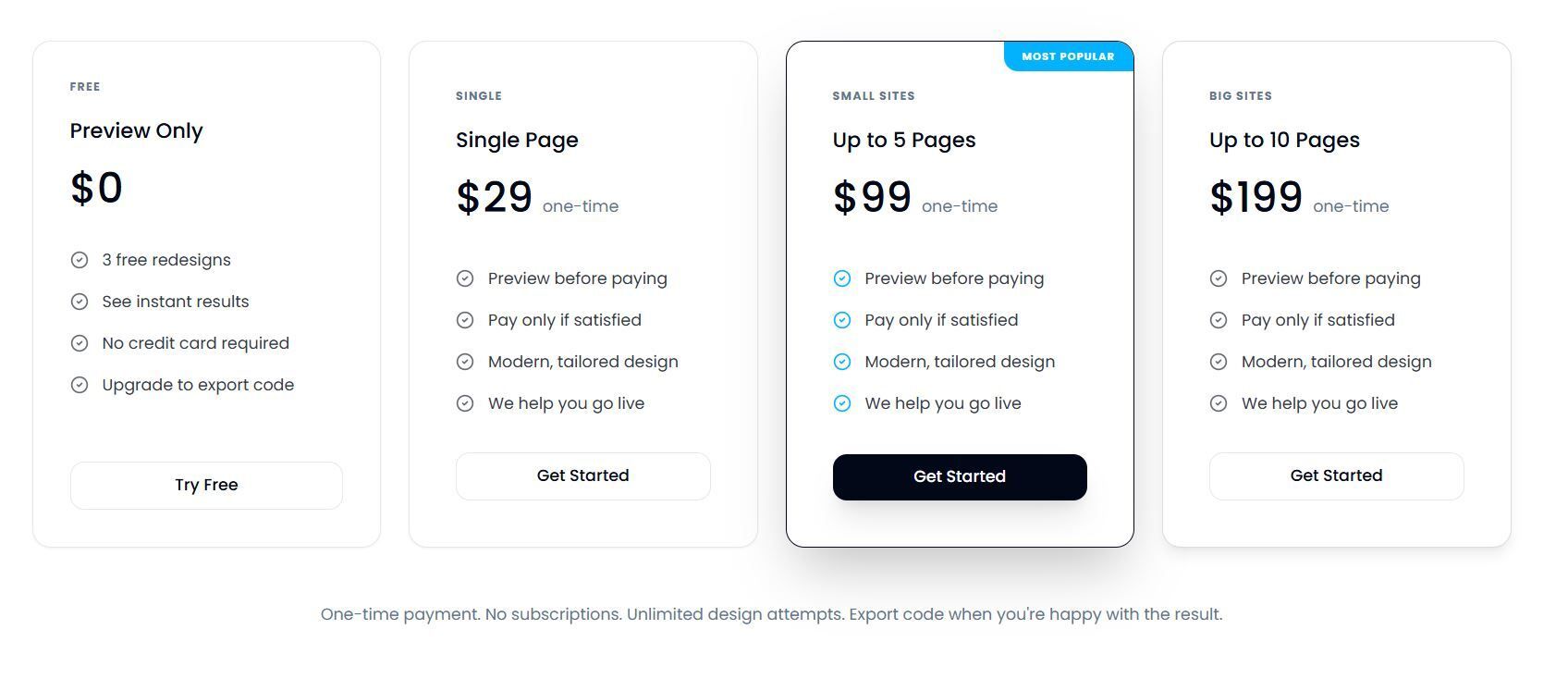 Users can try the platform with one free redesign to experience the value firsthand. After that, continued use requires a paid subscription. Access to exported production-ready code is also part of the paid offering.