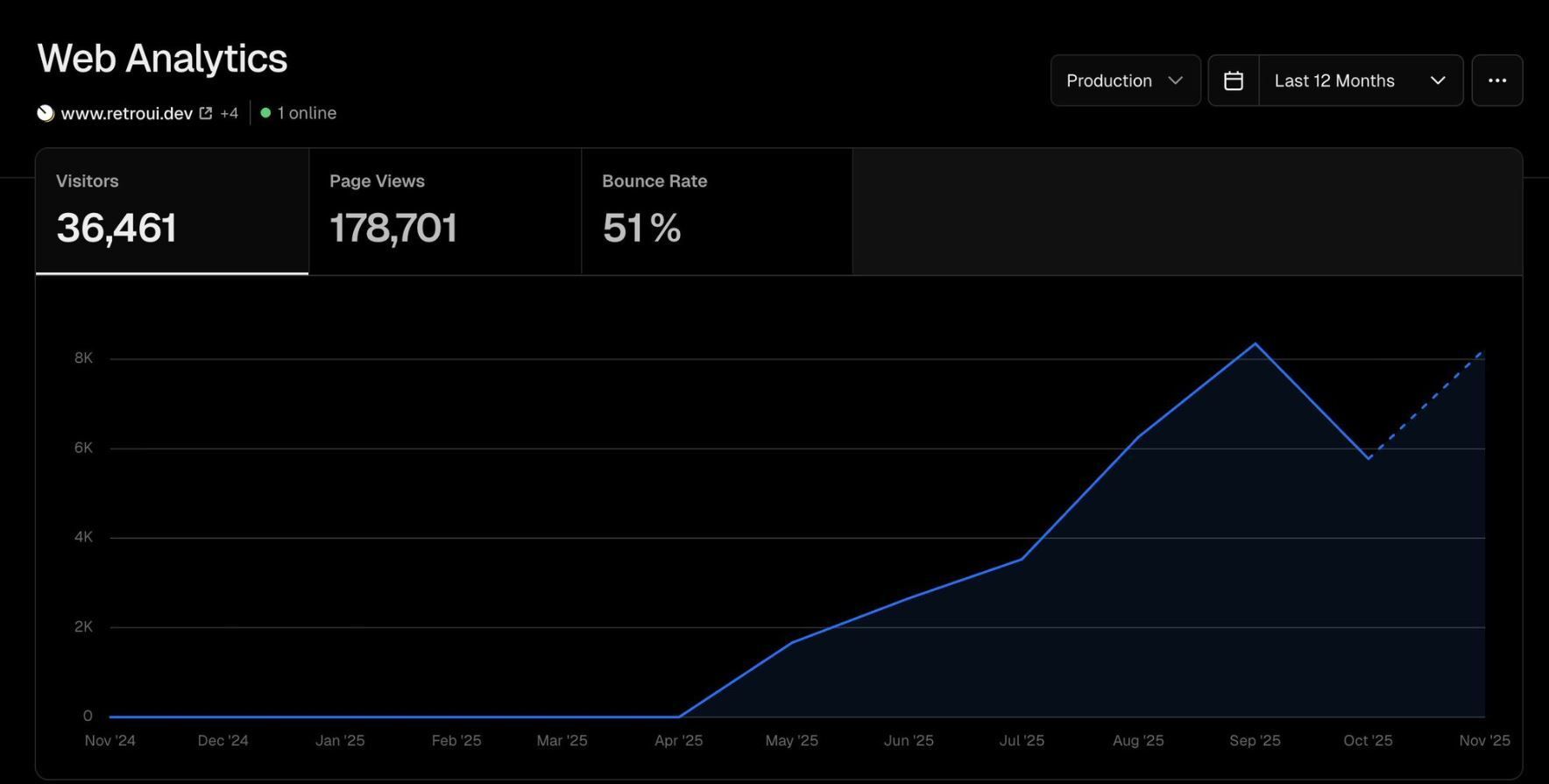 In September 2024, I made my first commit to what would later become RetroUI. I had no plans to monetize it! It was just an open-source side project I was passionate about. A month later, in October, I announced it publicly and shared it on my YouTube channel.